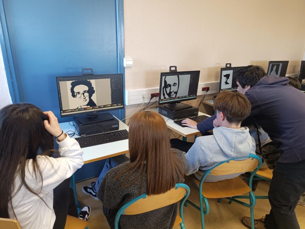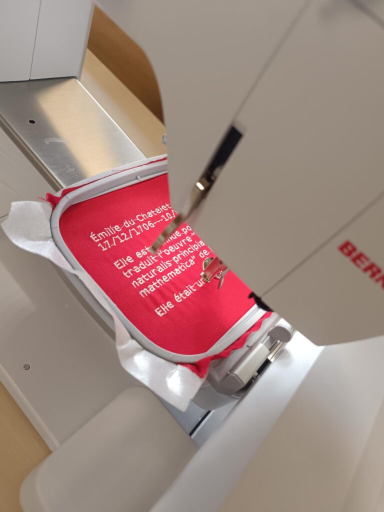Les élèves ont réalisé une bannière en tissu comportant les portraits floqués de femmes scientifiques accompagnés d’une citation brodée à l’aide d’un logiciel de dessin vectoriel et d’une brodeuse numérique ! ![]()