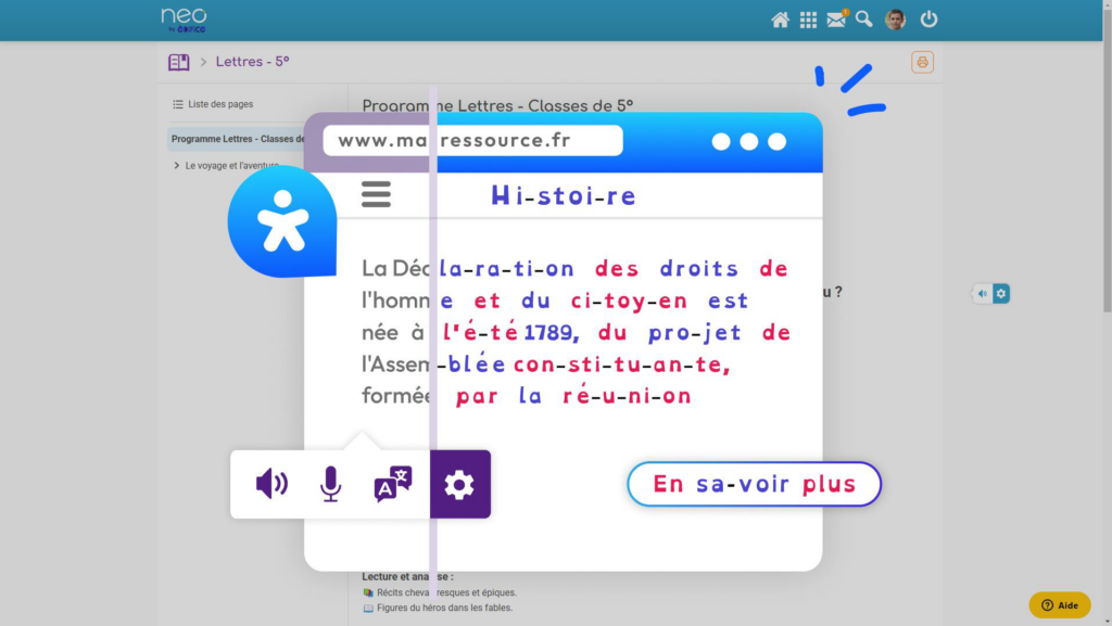 Cet outil vous accompagne partout sur l’ENT et permet d’adapter l’affichage des contenus en fonction de chaque besoin ou d’utiliser des outils de facilitation vocale.